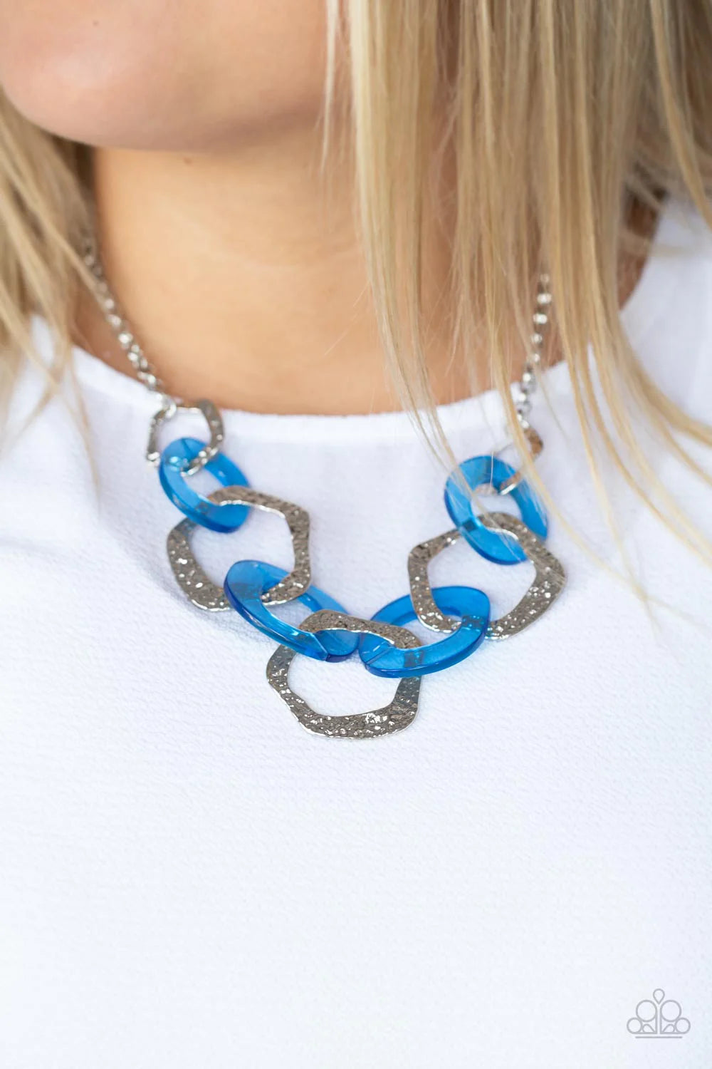 An asymmetrical assortment of neon blue acrylic rings and hammered silver hoops boldly interlock below the collar, creating an intense pop of color. Features an adjustable clasp closure.