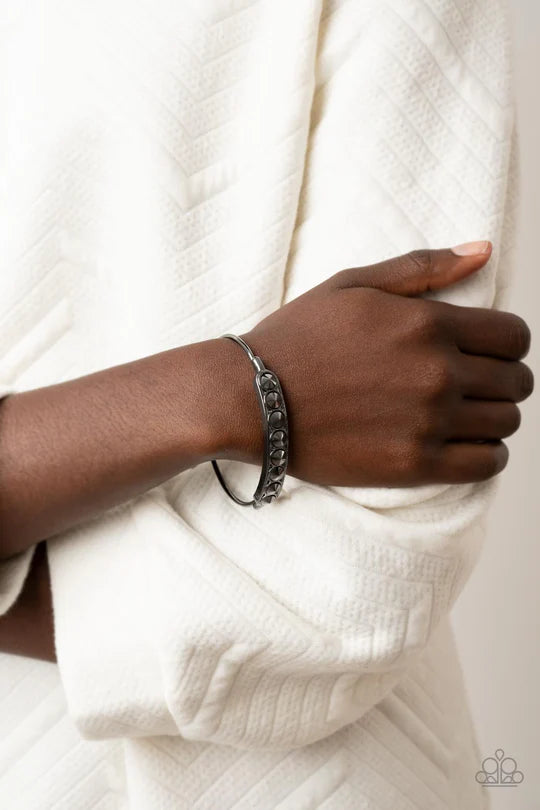 A frame of oversized hematite rhinestones is set atop a dainty gunmetal cuff featuring gunmetal beaded fittings, resulting in an edgy and stackable centerpiece.