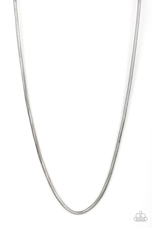 Brushed in a high-sheen shimmer, a rounded silver snake chain drapes across the chest for a sleek look. Features an adjustable clasp closure.