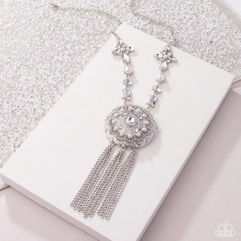 Delicately interrupting a silver cable chain, a floral pendant featuring marquise-cut and teardrop gem petals, with white pearl and white rhinestone centers joins tilted marquise-cut gems, rectangular white gems, and white half-pearls, spanning around the neckline giving way to an ornately-embellished white pearl, white gem, white rhinestone, silver filigree, and silver-studded airy floral pendant for a radiantly refined finish. A trio of classic silver chain tassels mesmerizingly sway from the pendant for an eye-catching finish. Features an adjustable clasp closure.