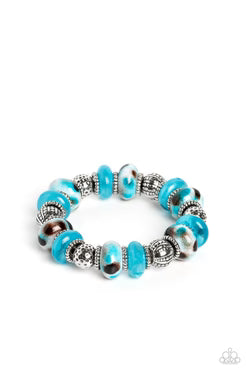 An earthy collection of dotted silver beads, rounded milky turquoise beads, studded silver rings, turquoise-spotted ceramic-like beads and textured silver beads are threaded along an elastic stretchy band around the wrist for an authentic artisan flair.