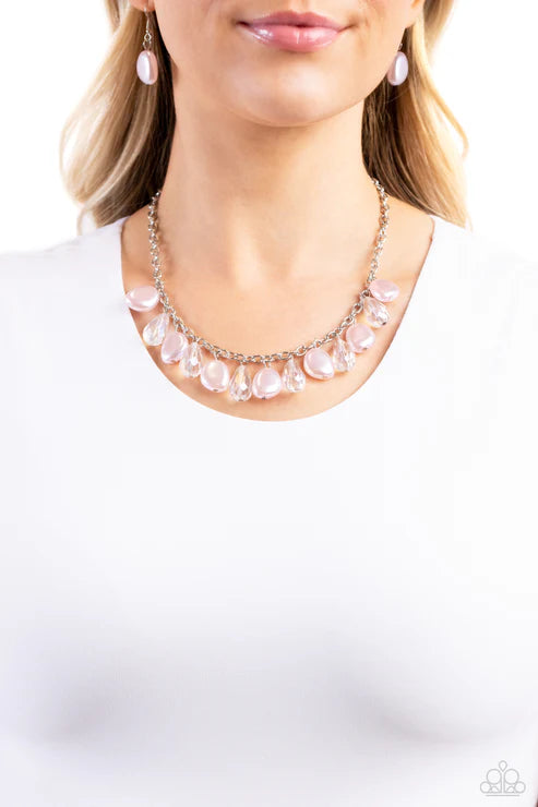 White crystal-like teardrops and oversized baby pink baroque pearls drip from the bottom of a shimmery silver link chain, creating a refined fringe below the collar. Features an adjustable clasp closure.