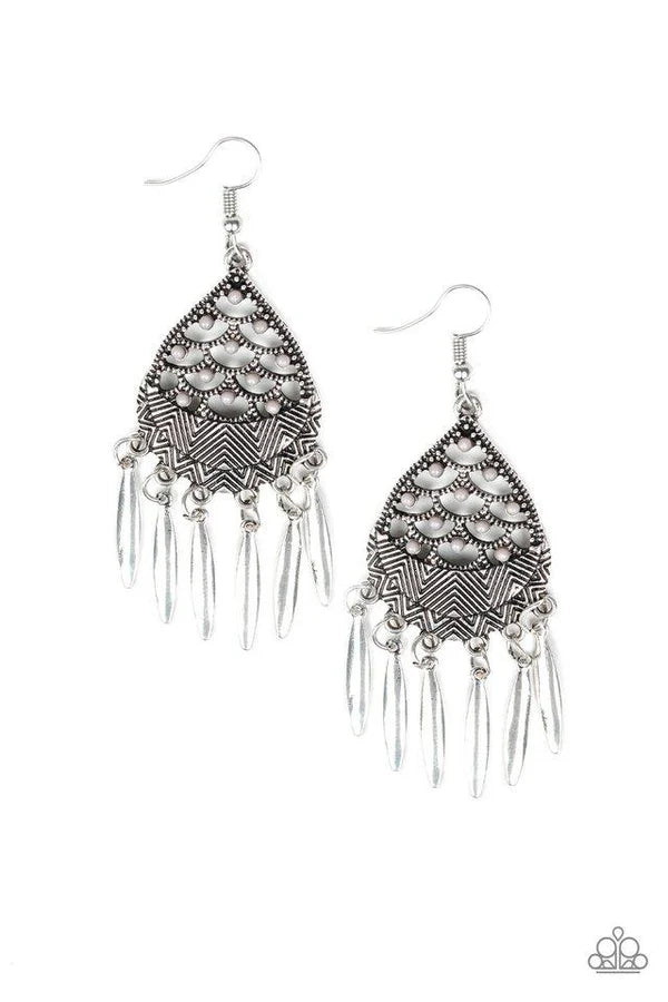 Etched in zigzagging textures, a gray beaded silver frame gives way to a fringe of flared silver bars for a dramatic tribal inspired look. Earring attaches to a standard fishhook fitting. Sold as one pair of earrings.