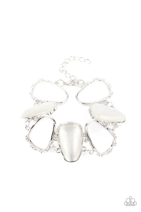 Encased in studded silver frames, a tranquil collection of asymmetrical white cat’s eye stone teardrops and airy silver frames delicately link around the wrist for an ethereally sparkly display. A sprinkling of rhinestones accent the open frames, adding a touch of elegance to the piece. Features an adjustable clasp closure.